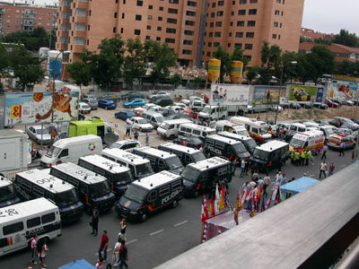 Ja nog var det livat att se matchen mellan de två madridlagen Real Madrid och Atlético Madrid på det sistnämnda lagets hemmaarena Vicente Calderón. Polisuppbådet var enormt och de kämpade hårt med att skilja de olika lagens supportrar. Stundom till och med sköt dom med gummikulor, riktigt läskigt.