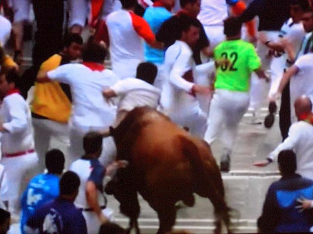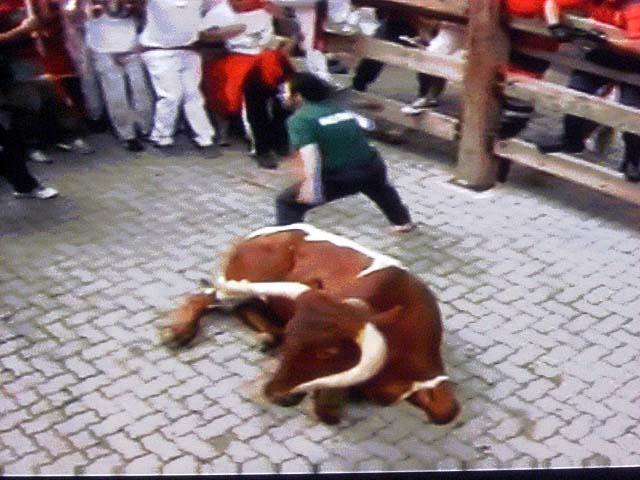 8 juli: Dagens tjurrusning varade i 3 minuter och 10 sekunder. Tjurarna från uppfödaren Cebada Gago skapade precis som förra året en farlig tjurrusning. Förutom trampskador som uppstår när tjurrrusarna faller har två personer blivit stångade av tjurarna, en 21-årig amerikanare som fick skador på ankeln på Calle Stafeta, samt en 24 årig australiensare som fick lårskador på tjurfäktningsarenan när den bruna tjuren Escuillo som var på efterkälken till sist kom in. Det såg riktigt farligt ut och kunde gått betydligt värre.